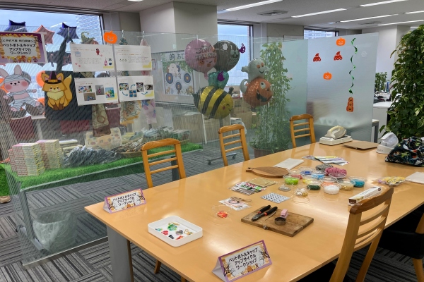 札幌支店では、ファミリーデーに合わせて、不要になったペットボトルキャップを活用した「アップサイクルワークショップ」を開催しました。身近な素材を通して環境への取り組みを感じていただけるよう、日頃は捨ててしまいがちなペットボトルキャップを使ってチャームやしおりを制作する体験スペースを設置。色とりどりのパーツを自由に組み合わせ、世界に一つだけのキーホルダーやしおりが完成しました。