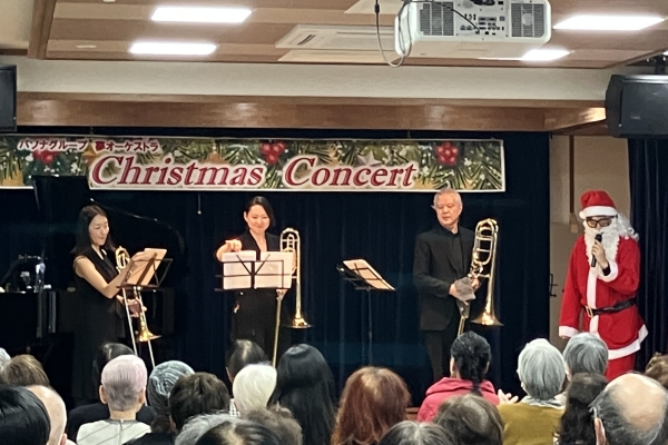 中央区にある「いきいき桜川敬老館」で、地域のご高齢者に向けたクリスマスコンサートを開催しました。有志で集まった「パソナグループ夢オーケストラ」による演奏と、社員ボランティアがコンサートを盛り上げました。 今年は例年以上に多くの方にお越しいただき、同施設のイベントとして過去最多の来場となりました。演奏は総勢21名の編成で、ホルンやトロンボーンのアンサンブル、コントラバスなど会場に豊かな音色が響きました。