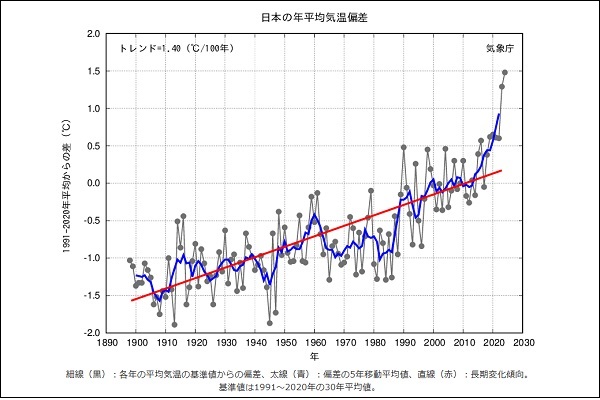 気象庁は2024年の日本の平均気温が、平年値(20年までの30年間平均)を(問1 )上回り、1898年の統計開始以降で最も高くなったと発表した。2023年の平年プラス1.29度を超え2年連続で記録を更新した。