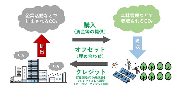 企業はまず、自社が排出しているCO₂の排出量を知ることが大切です。そして、CO₂削減の努力を行うわけですが、どうしても削減しきれないCO₂を温室効果ガス削減・吸収の取り組みに資金を提供する(クレジットを購入)することでオフセット(埋め合わせを)します。このことをカーボンオフセットと呼んでいます。