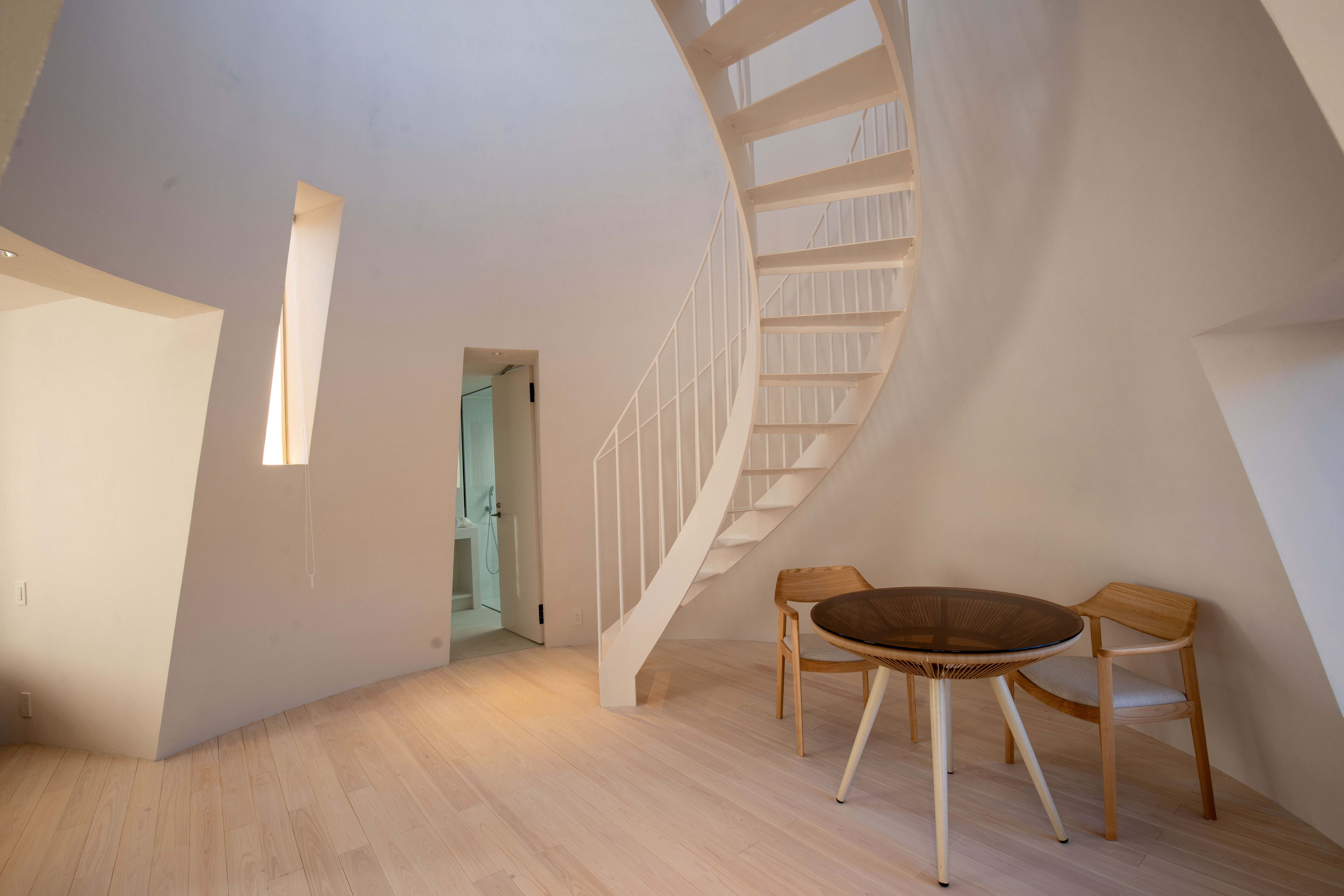 リビングとして使われる塔を中心に個々の部屋が 集まり繋がり合う空間が特徴。 塔の内外を巡る階段を介して室内から屋上の庭、周囲を一望できる頂上へと辿りつく。 小さな建物でありながら多様な居場所が見つけられる建築