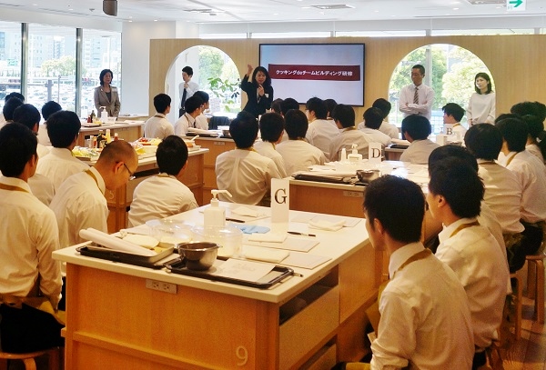 4月15日(金)、神奈川県横浜市のABCクッキングスタジオで、東芝三菱電機産業システム株式会社に入社した新入社員60名が、この研修に参加しました。講師は、元国際線客室乗務員で、企業・官公庁でのマナー研修や講演など幅広い実績のある宮本朋子さん。研修は、宮本講師の座学から始まります。
