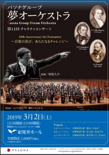 株式会社パソナグループ(本社:東京都千代田区、代表取締役グループ代表 南部靖之)は、パソナグループのエキスパートスタッフ(派遣登録社員)やクライアント企業、グループ社員によって構成されるパソナグループ「夢オーケストラ」の設立10周年を記念し、チャリティコンサート『10th Anniversary the Formation ~音楽の喜び、あらたなるチャレンジ~』を3月2日(土)に紀尾井ホールにて開催いたします。 パソナグループ「夢オーケストラ」は、パソナグループに関わる方々が、音楽を通じて互いの絆を深めることを目的に2008年7月に設立されました。現在約60名の団員が月2回、平日の仕事の後に練習を重ねています。 10周年を記念した今回のコンサートでは、東京ニューシティ管弦楽団で正指揮者を務める曽我大介氏の指導のもと、ベートーヴェン「運命」、シューベルト「未完成」、ドヴォルザーク「新世界より」の三大交響曲を演奏します。今まで演奏してきた曲の中で最も好評だった3曲を演奏することで、10年間の感謝の気持ちを伝えるとともに、次の10年間に向けて新たな一歩を踏み出します。 パソナグループは本取り組みを通じて、パソナグループに携わる多くの方々が音楽を通じて交流を深めるきっかけを提供するとともに、会場で実施する募金活動の収益金の一部を、震災で被災した子供たちへの音楽教育支援等に寄付してまいります。