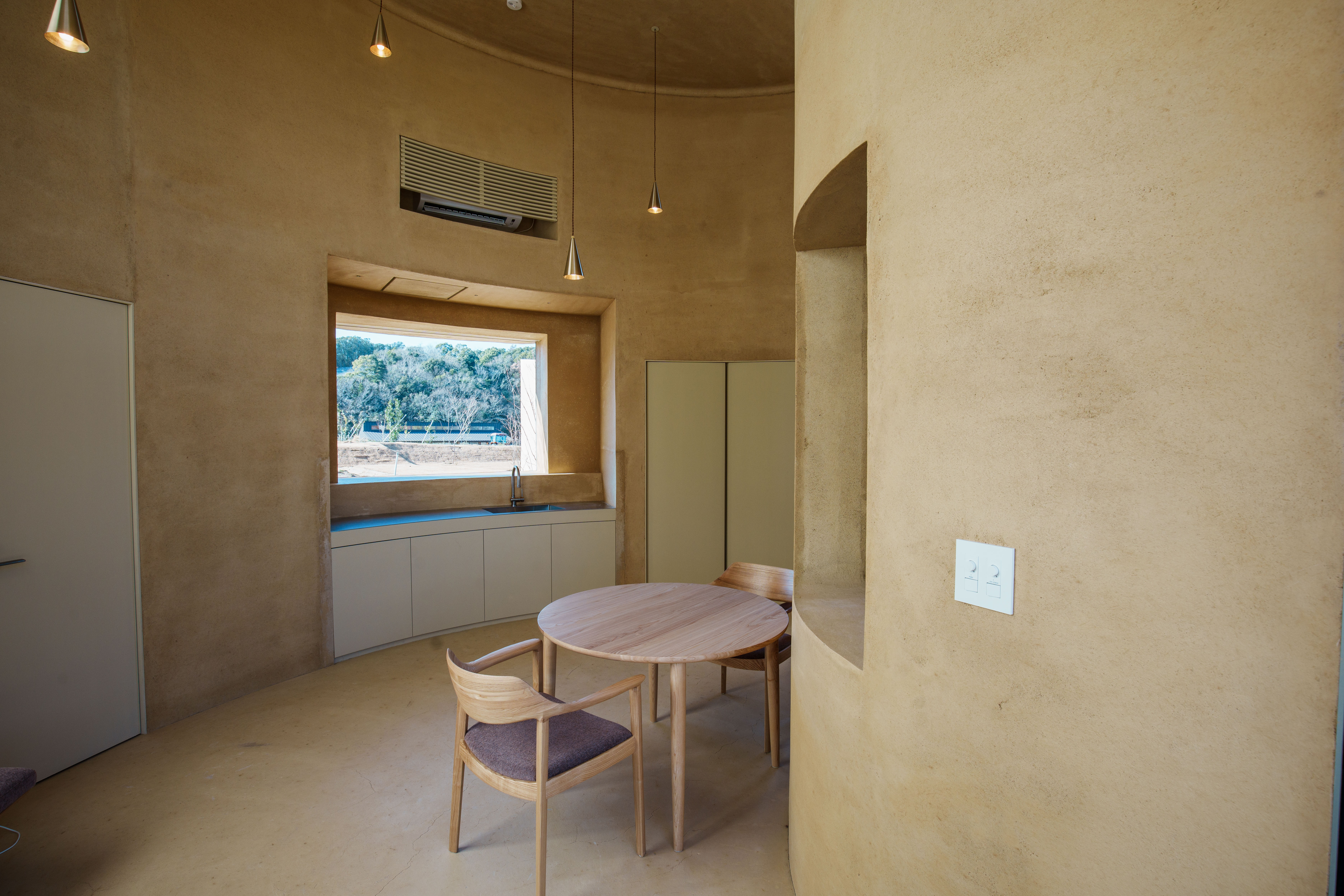リビングとして使われる塔を中心に個々の部屋が 集まり繋がり合う空間が特徴。 塔の内外を巡る階段を介して室内から屋上の庭、周囲を一望できる頂上へと辿りつく。 小さな建物でありながら多様な居場所が見つけられる建築