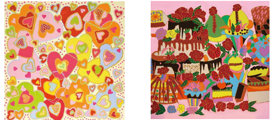▲醍醐 恵子「色んな大きさのハート」61X61cm ▲醍醐 恵子「ヴァレンタイン・ケーキ」65X65cm