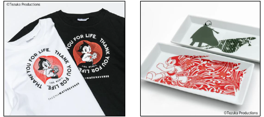 「PASONA NATUREVERSE SHOP」では、パビリオン内で販売をしていたお菓子やお茶などの食品、アクリルスタンドや手ぬぐいといった雑貨類、Tシャツや帽子などの衣類に加え、焼き物などの工芸品約100品を販売いたします。さらに、鉄腕アトムの生みの親である手塚治虫氏ゆかりの手塚治虫書店グッズも用意し、万博パビリオンでの思い出を多面的に振り返っていただけるラインアップを取り揃えています。