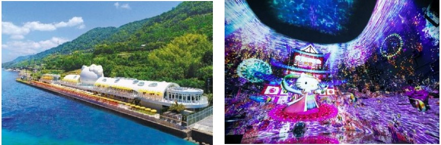乙姫の衣装を着たハローキティと海の生き物が行き交う幻想的な竜宮城を表現したメディアアートエリアと2か所のレストランを併設。メディアアートエリアは8つに分かれ、海中を漂うような体験ができる水中洞窟、水反射を表現した鏡迷路や巨大万華鏡など、竜宮城へ誘われる非日常的な空間を演出しています。また、レストランでは、淡路島産の食材にこだわった身体に優しい健康的な一人鍋や、飲茶などを提供し、播磨灘の景色を眺めながらゆったりとした時間をお過ごしいただけます。