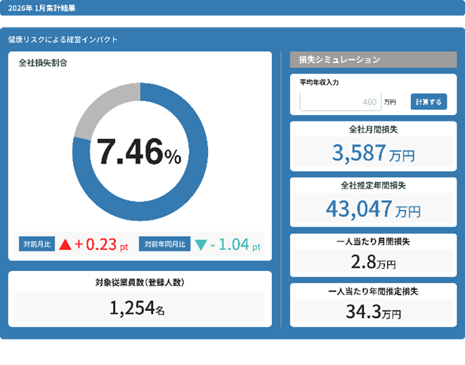 本プラットフォームでは、従業員の健康診断結果や、労働時間等の情報を一元管理すると共に、従業員が定期的に回答する問診(サーベイ)の結果を組み合わせることで、管理者が、組織別の健康リスクやプレゼンティーズム※等による経済損失額の閲覧が可能になると共に、パフォーマンス阻害要因の分析等も行いやすくなります。
