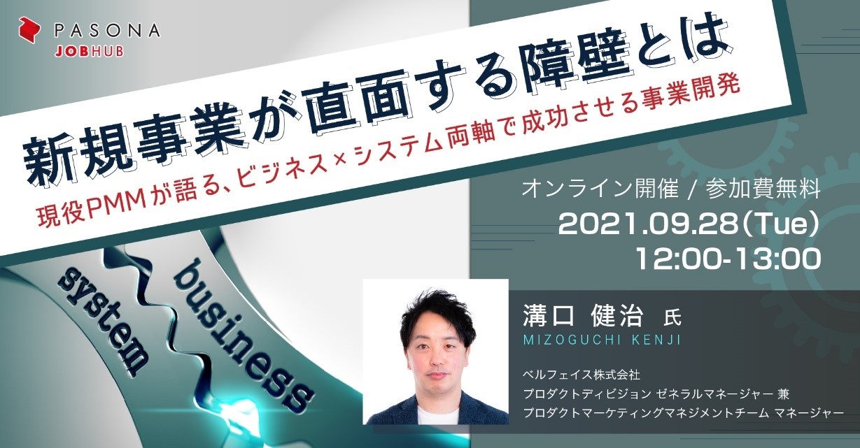 そこでこの度、パソナJOB HUBは、ウェビナー『新規事業が直面する障壁とは ~現役PMMが語る、ビジネス×システム両軸で成功させる事業開発~ 』を9月28日(火)に開催いたします。